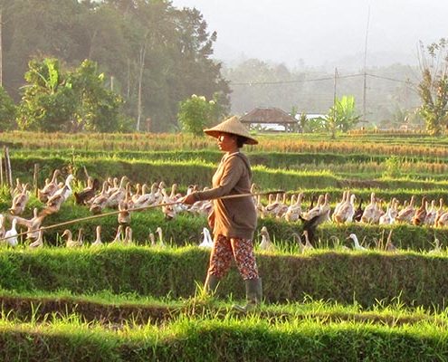 Pak Coco is the GodFather of the duck mafia in the village of Mongan where Bali Silent Retreat sits at the base of Holy Mount Batukaru. He rules his nomadic herd with a flag pole, a kind, generous and a patient leader. He guides his quacking tribe in and out of the rice fields as they feast on water weeds, insects, larvae and other competitors to baby rice plants.